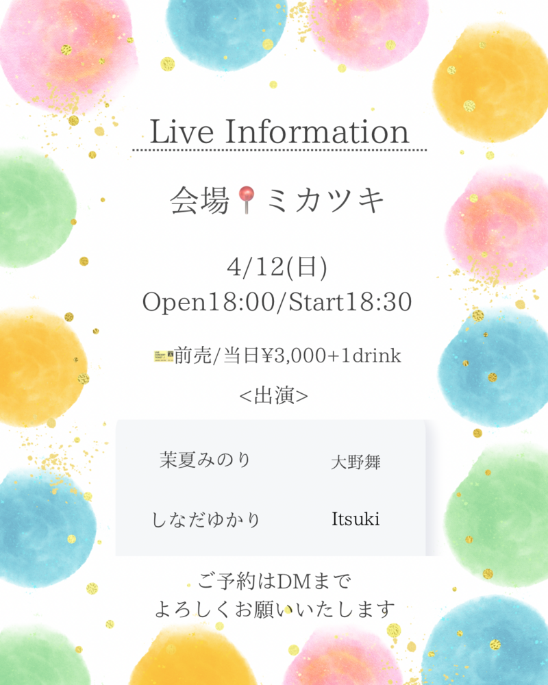 ミカツキ SCHEDULE 2026/04/12(日) ミカツキ Open18:00/Start18:30 前売/当日¥3,000+1drink 出演:茉夏みのり/大野舞/しなだゆかり/Itsuki 配信チケット URLをコピーする 報告する