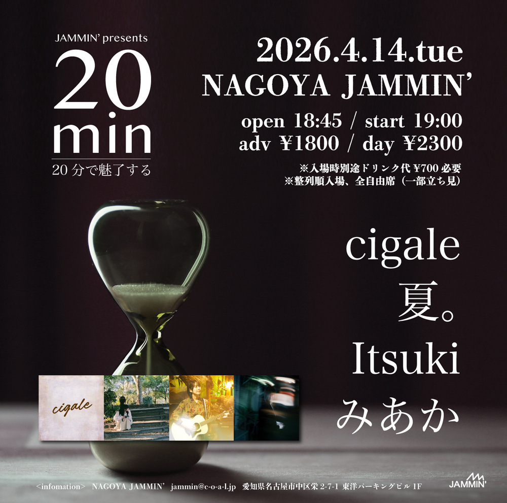 20min SCHEDULE 2026/04/14(火) 18:30 - NAGOYA JAMMIN' Open18:30/Start18:45 前売¥1,800/当日¥2,300+1drink 出演:cigale/夏。/みあか/Itsuki URLをコピーする 報告する