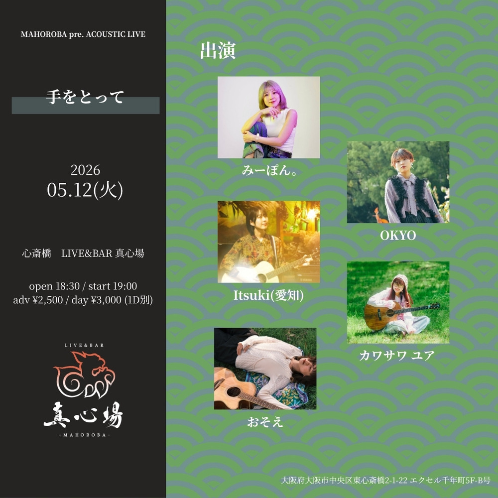 手をとって SCHEDULE 2026/05/12(火) 18:30 - 真心場 Open18:30/Start19:00 前売¥2,500/当日¥3,000+1drink 出演:みーぽん。/OKYO/カワサワユア/おそえ/Itsuki 投げ銭 URLをコピーする 報告する