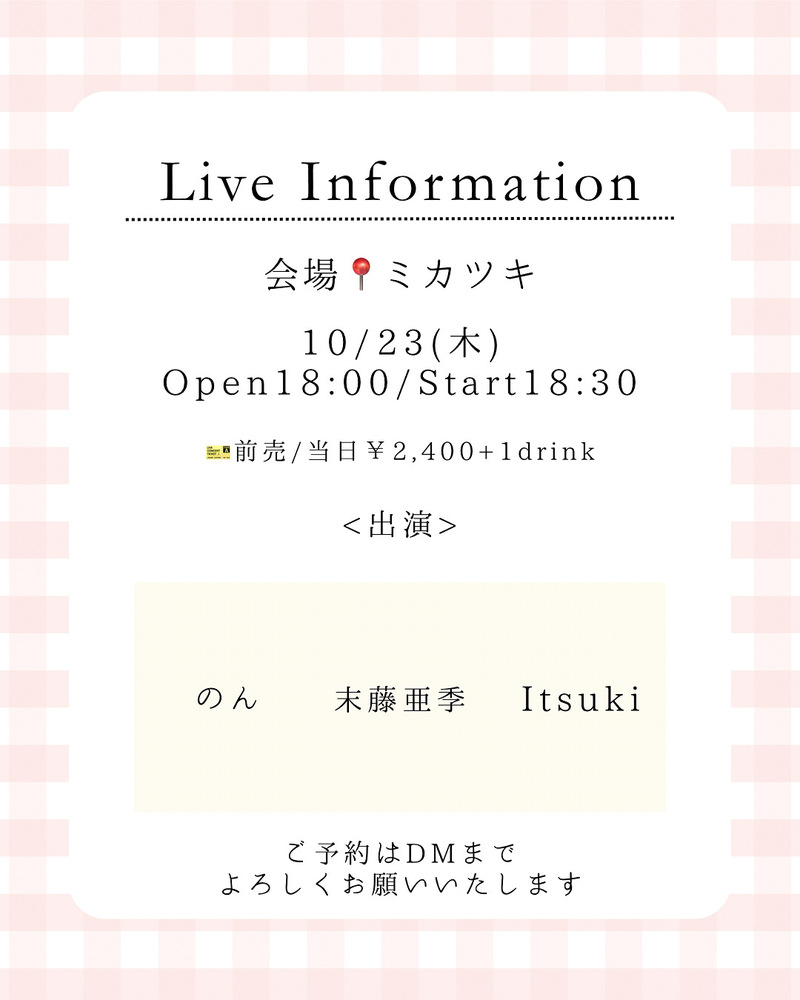 ミカツキ SCHEDULE 2025/10/23(木) 18:00 - ミカツキ Open18:00/Start18:30 前売/当日¥2,400+1drink 出演:のん/末藤亜季/Itsuki Itsukiの出演時間は19:50~20:20になります! ご予約は各SNSのDM、またはオフィシャルサイトのcontactまで! URLをコピーする 報告する