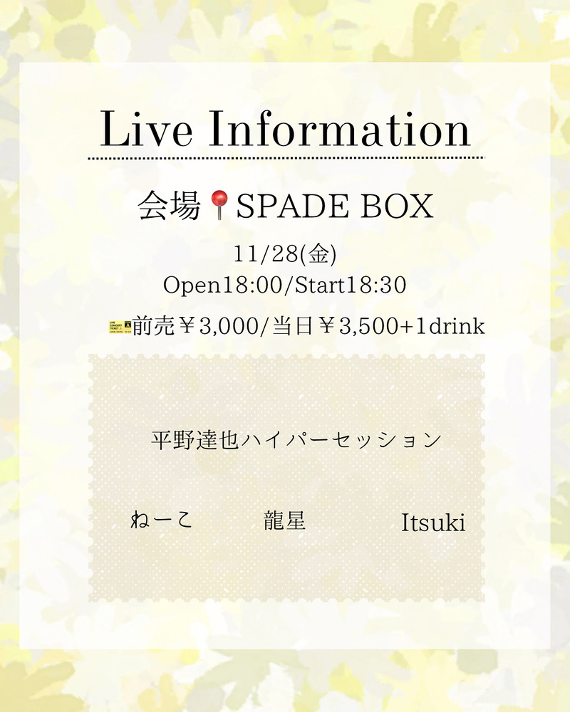 MUSIC BOX83 SCHEDULE 2025/11/28(金) 18:00 - SPADE BOX Open18:00/Start18:30 前売¥3,000/当日¥3,500+1drink 出演:平野達也ハイパーセッション/ねーこ/龍星/Itsuki URLをコピーする 報告する