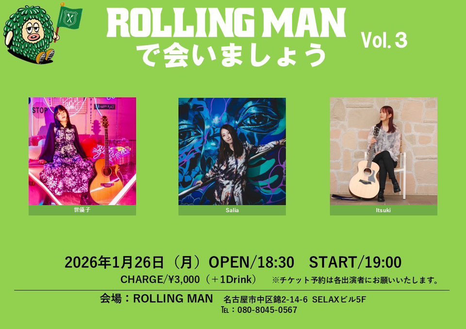 ROLLING MANで会いましょう SCHEDULE 2026/01/26(月) 18:30 - ROLLING MAN 地図を表示 Open18:30/Start19:00 前売/当日¥3,000+1drink 出演:世優子/Salia/Itsuki Itsukiの出演時間は19:00~19:40になります! ご予約は各SNSのDM、またはオフィシャルサイトのcontactまで! URLをコピーする 報告する