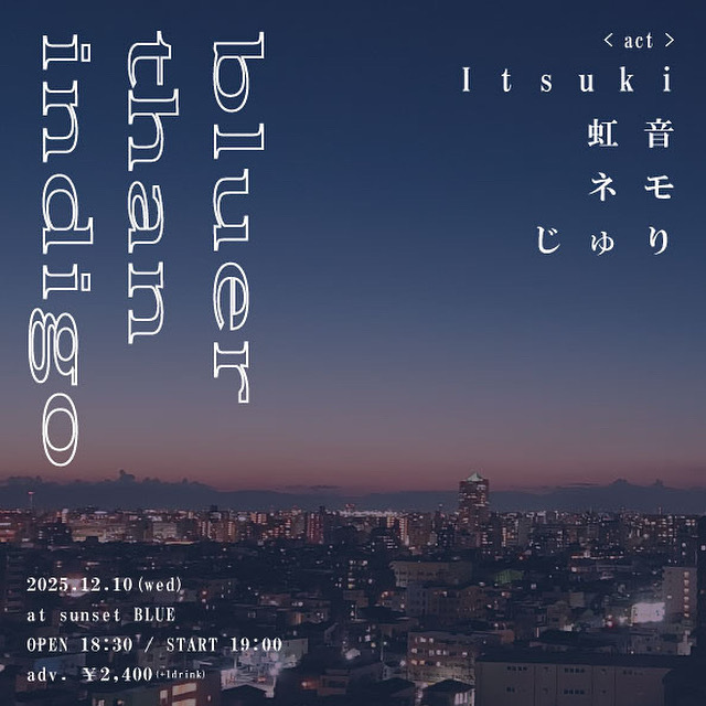 bluer than indigo SCHEDULE 2025/12/10(水) 18:30 - sunset BLUE Open18:30/Start19:00 前売/当日¥2,400+1drink 出演:虹音/ネモ/じゅり/Itsuki Itsukiの出演時間は20:45~21:15になります! ご予約は各SNSのDM、またはオフィシャルサイトのcontactまで! URLをコピーする 報告する