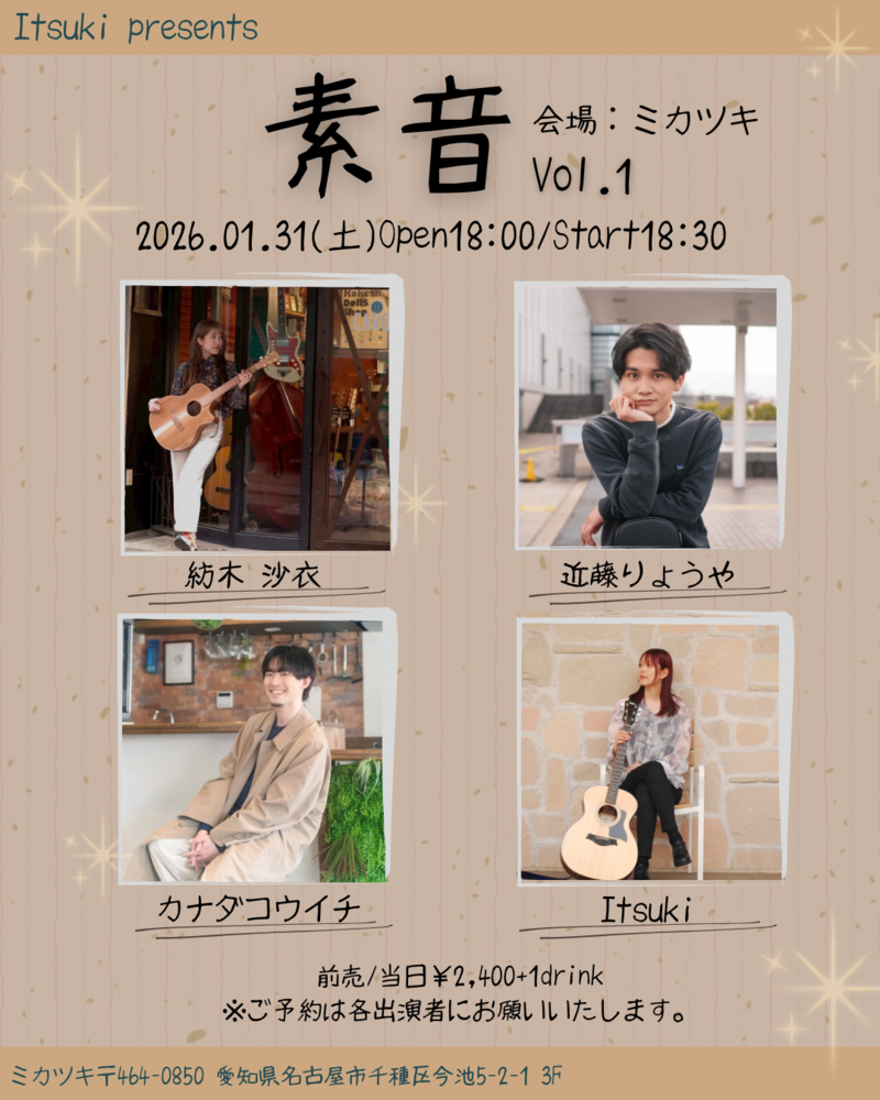 素音 Vol.1 SCHEDULE 2026/01/31(土) 18:00 - ミカツキ Open18:00/Start18:30 前売/当日2,400+1drink Itsuki初企画ライブ! 出演:紬木沙依/近藤りょうや/カナダコウイチ/Itsuki Itsukiの出演時間は20:30~になります! ご予約は各SNSのDM、またはオフィシャルサイトのcontactまで! URLをコピーする 報告する