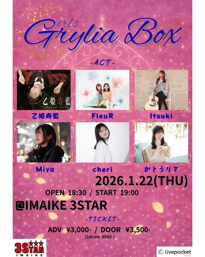 Girls Grylia Box SCHEDULE 2026/01/22(木) 18:30 - 今池3STAR Open18:30/Start19:00 前売¥3,000/当日3,500+1drink 出演:乙姫寿藍/FleuR/Miya/cheri/かとうりさ/Itsuki ご予約はLive Pocketにて! Live Pocket URLをコピーする 報告する