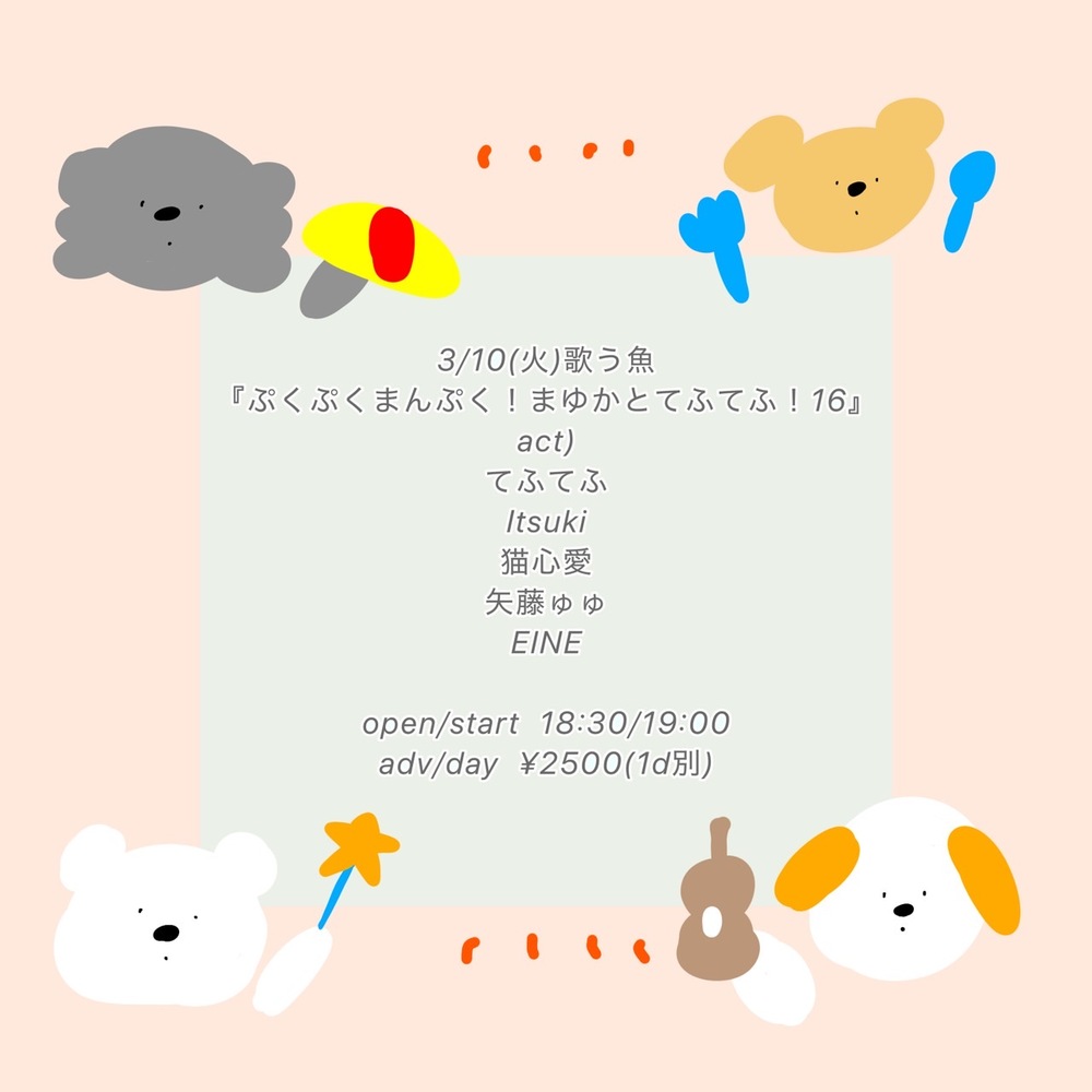 ぷくぷくまんぷく!まゆかとてふてふ!16 SCHEDULE 2026/03/10(火) 18:30 - 歌う魚(大阪) Open18:30/Start19:00 前売/当日¥2,500+1drink 出演:てふてふ/猫心愛/矢藤ゅゅ/EINE/Itsuki URLをコピーする 報告する